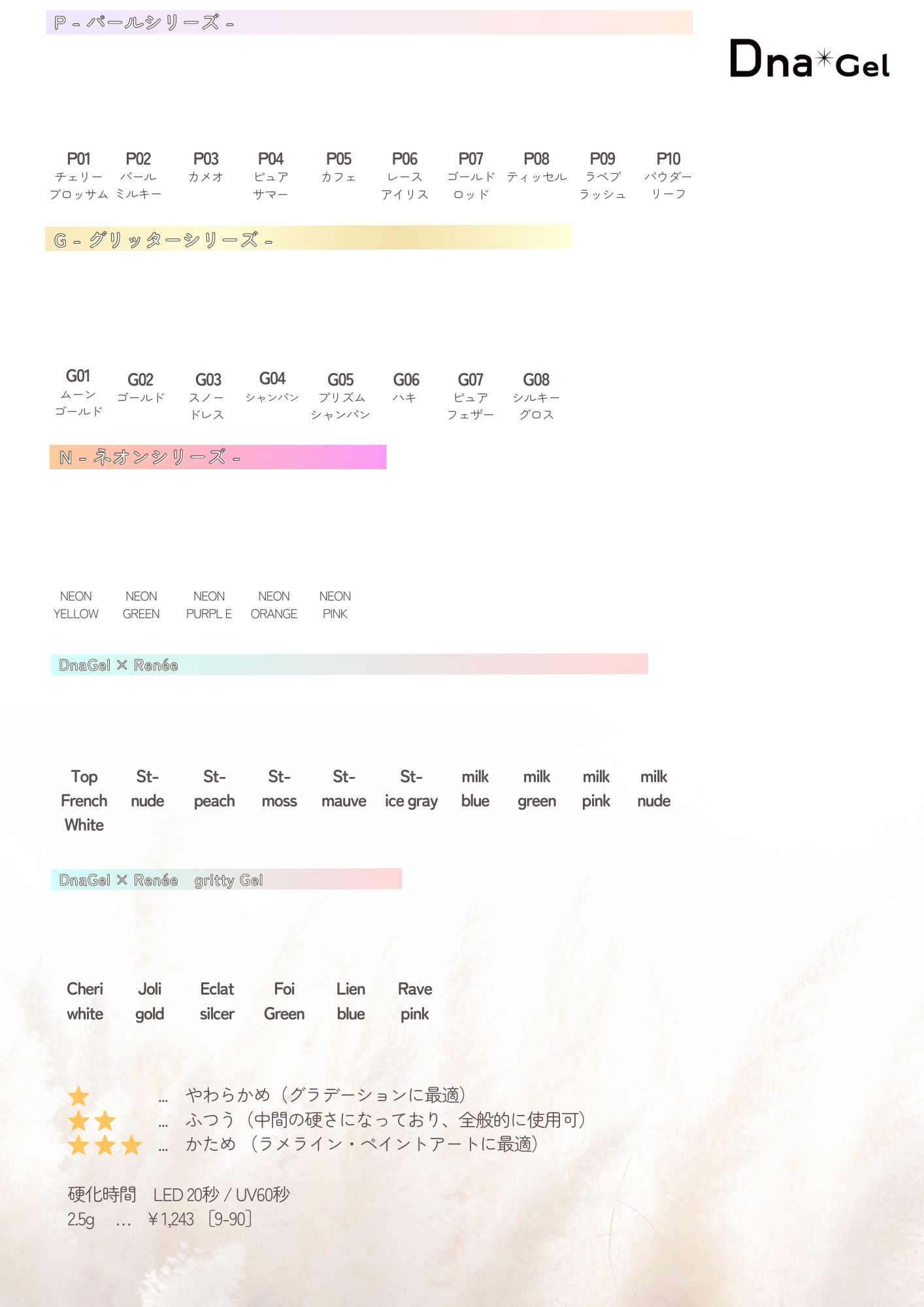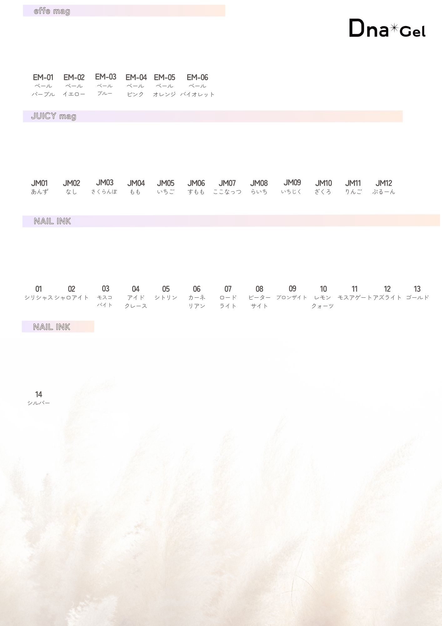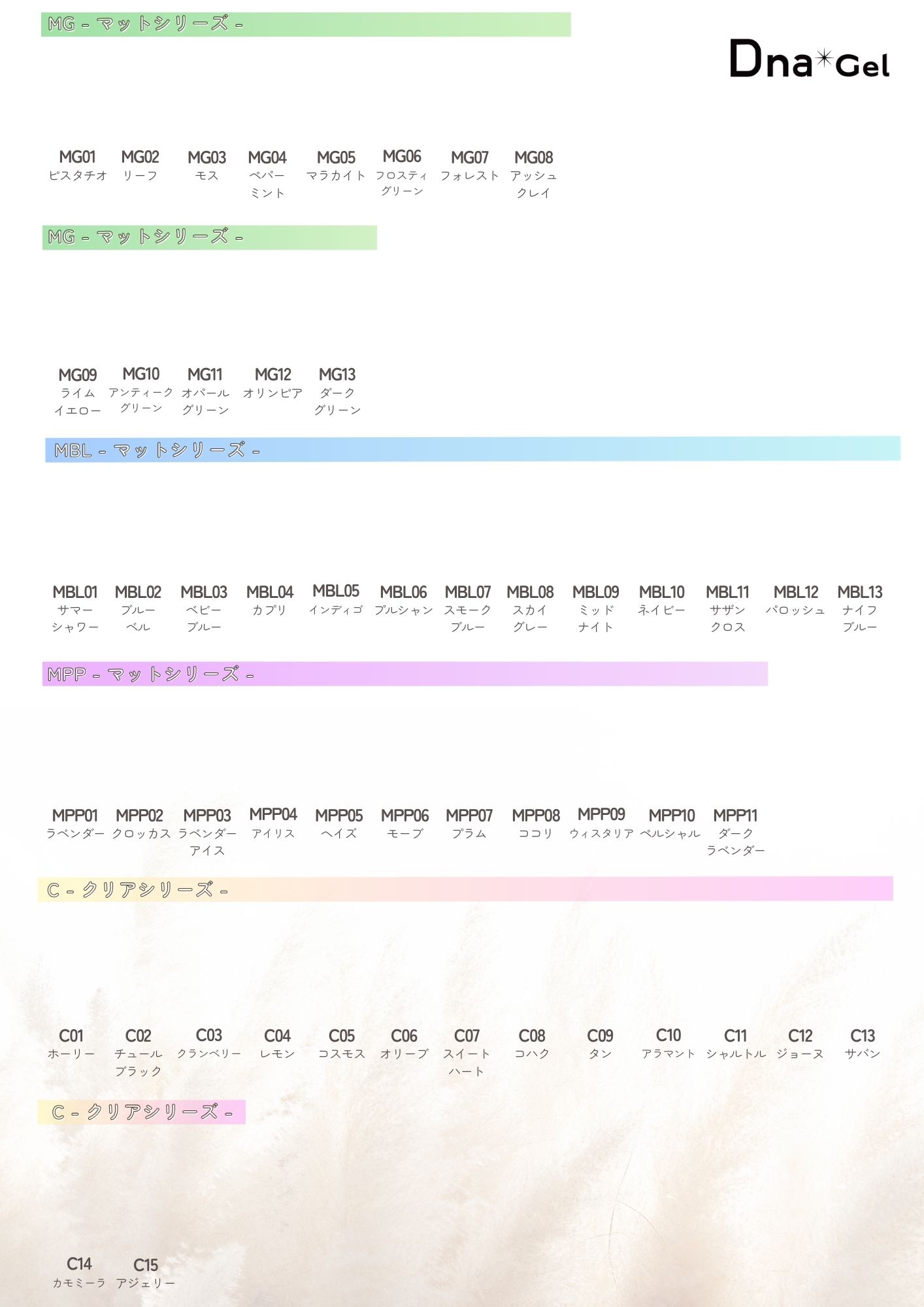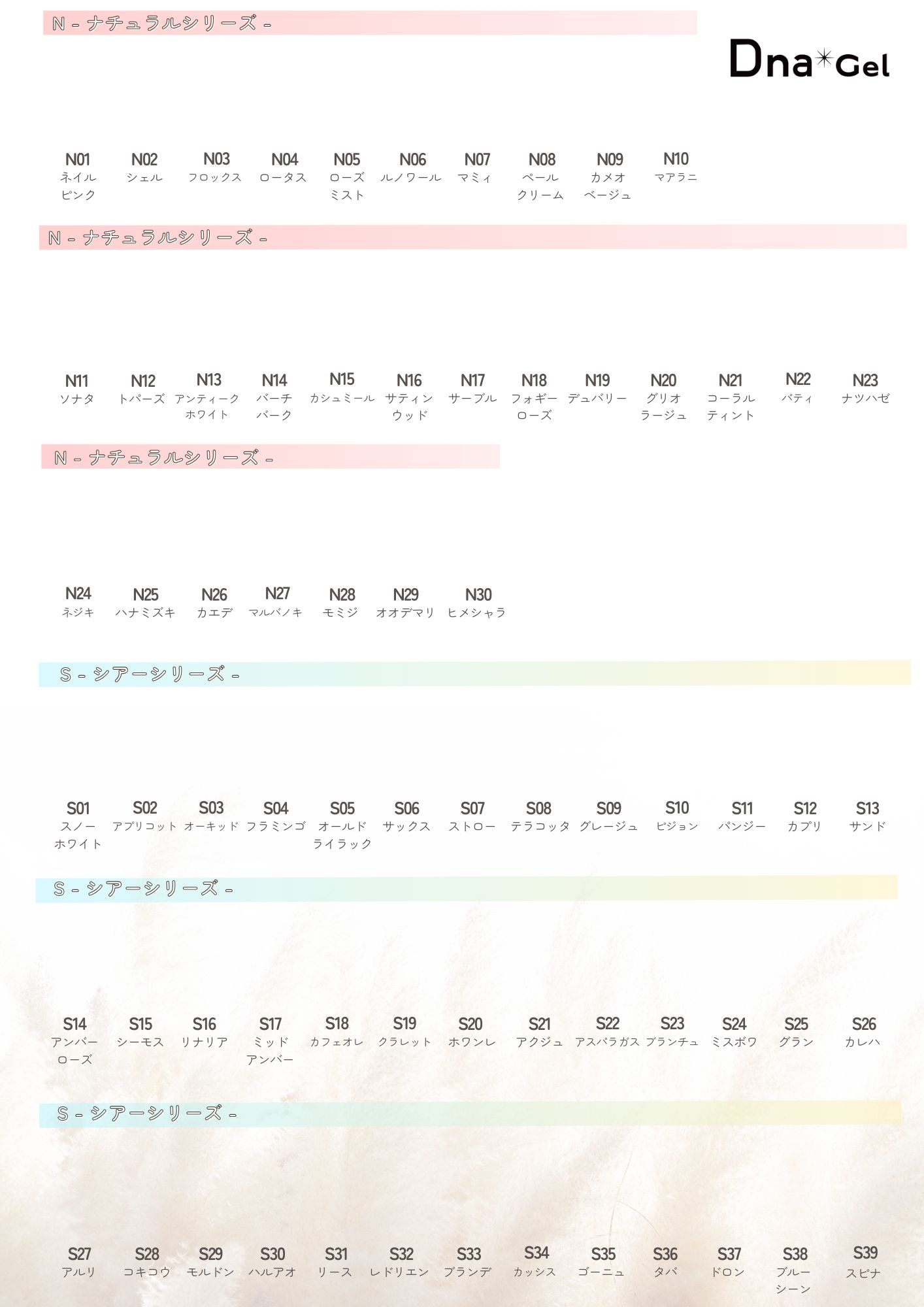 DnaGelのカラージェル全色(※一部対象外あり)のカラーチャートを貼り付けてご使用頂ける台紙になります。